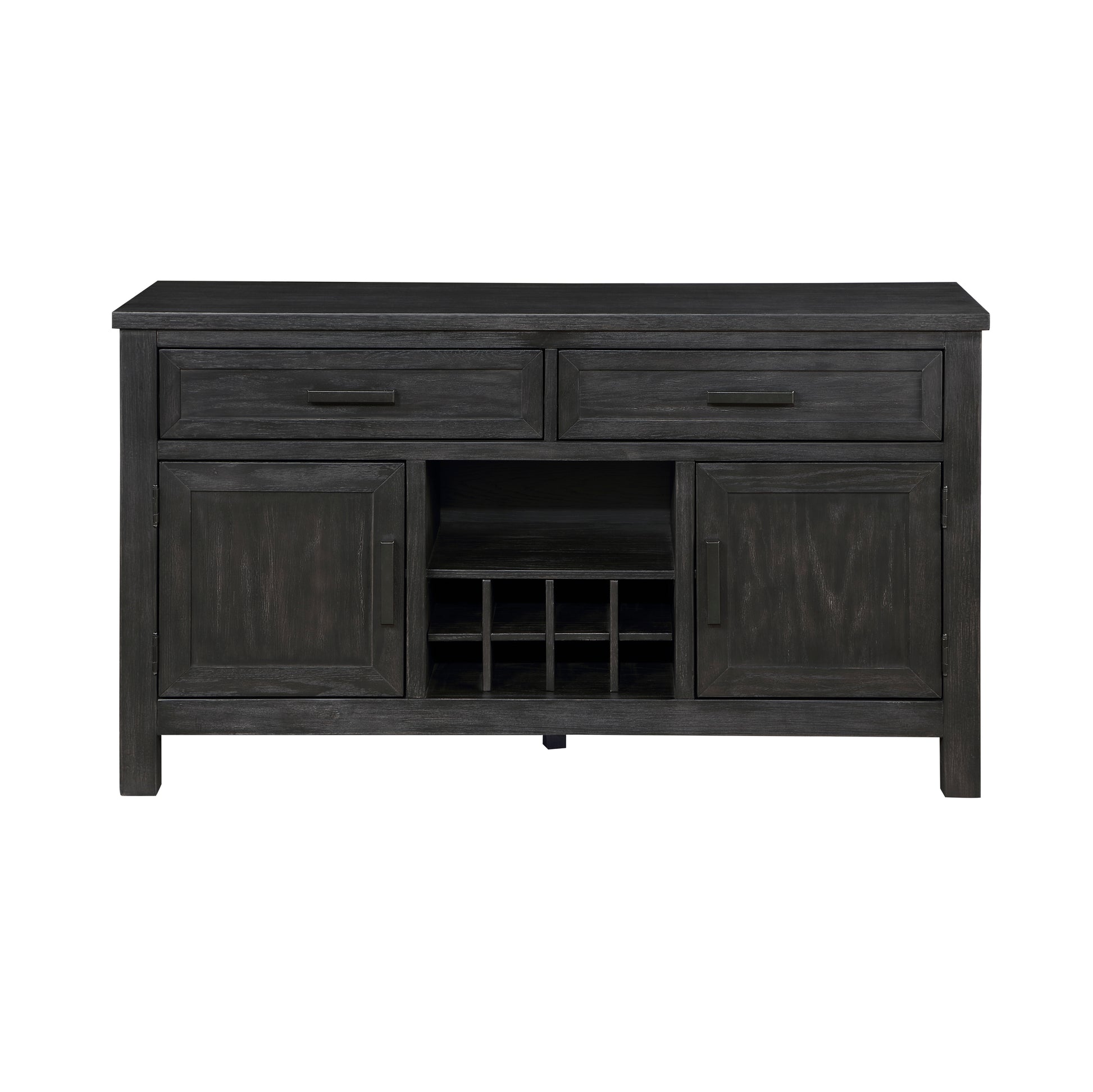 The transitional framing of the Orem Collection will provide a perfect mealtime platform for your casual dining room. The antique black finish of the collection’s oak veneer creates a versatile decorative accent to your space. Providing storage space within your dining room is the server. Drawers and behind door shelving allow for in-room storage of your tabletop decorative items and soft goods. A removable wine rack along with wine glass storage furthers the unit’s functionality.