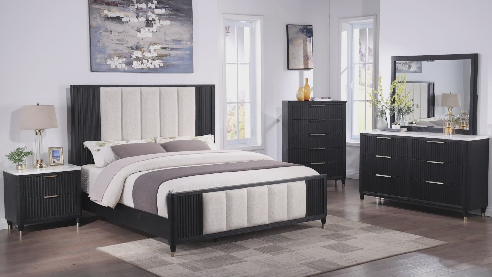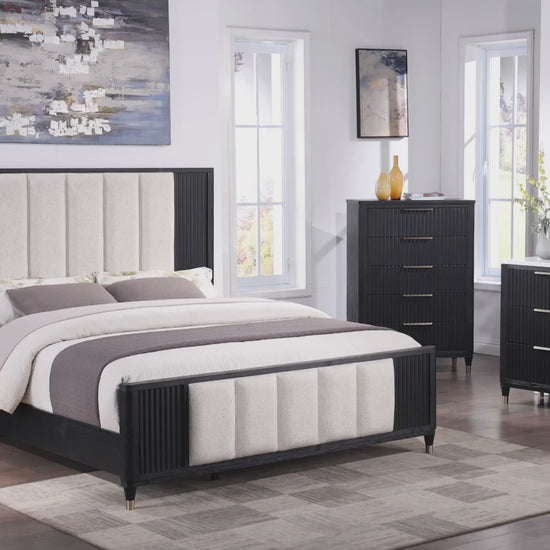 Elevate your sanctuary with this chic and contemporary bedroom ensemble that blends functionality with a sleek, modern aesthetic. The collection features a luxuriously upholstered bed, showcasing a high headboard and footboard with a refined fabric selection that exudes comfort and sophistication. Accompanying the statement bed are matching pieces, including a streamlined dresser, nightstand and chest, each sporting a minimalist design with crisp engineered stone tops and bold, brass-accented hardware.