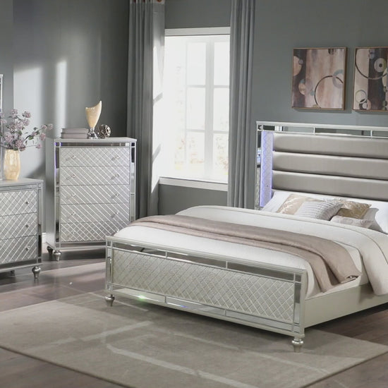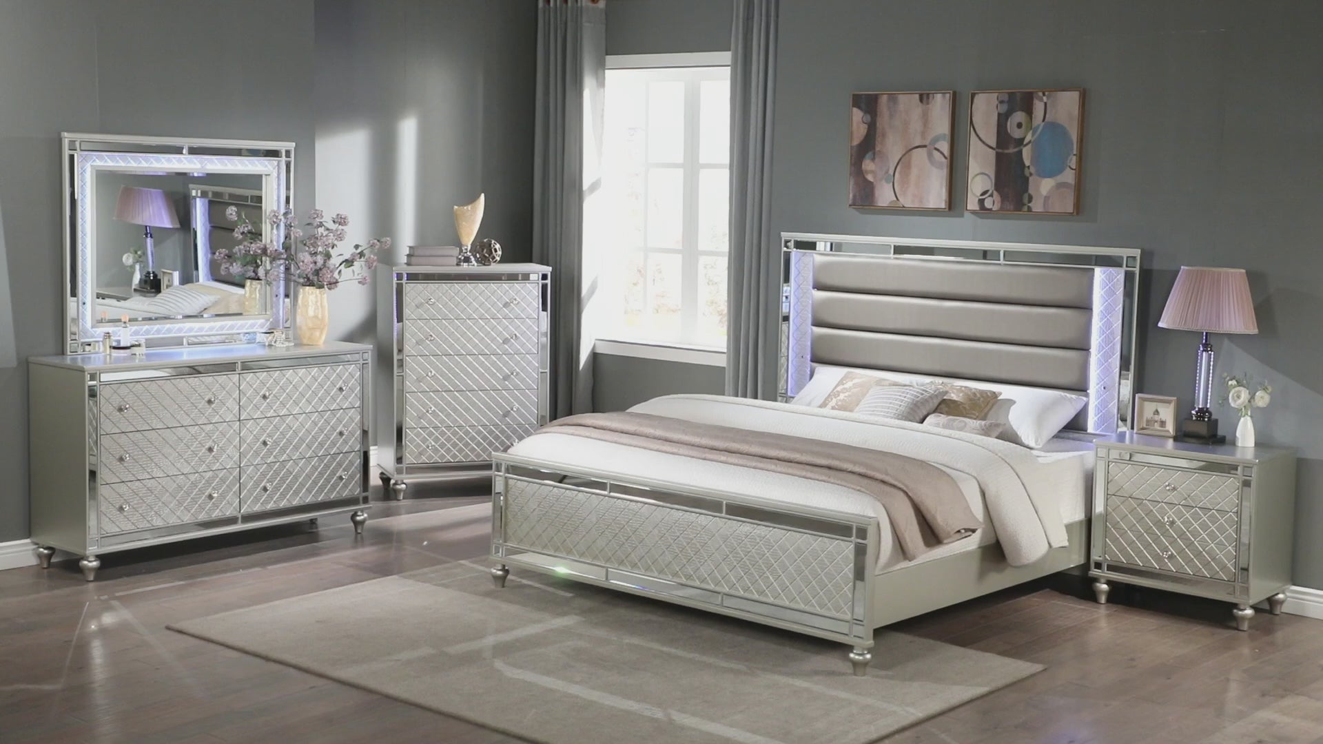 Elevate your sanctuary with this dazzling bedroom collection, where contemporary chic meets timeless charm. The suite boasts a stunning silver finish, imbuing your space with an air of sophistication and modern luxury. At the heart lies a plush, channel tufted bed that invites you to indulge in comfort, highlighted by integrated LED lighting. Ample storage solutions are provided through sleek, lined dressers and nightstands, where functionality meets finesse.