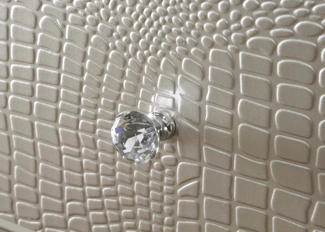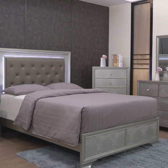 Step into a realm of sophistication and comfort with this stunning bedroom collection. Each piece showcases an exquisite blend of traditional charm and contemporary flair, making a bold statement with its textured surfaces and crisp white finish. The bed, a centerpiece of luxury, features a sumptuous, tufted headboard with integrated lighting that invites a touch of opulence to your restful retreat. Coordinating storage solutions, including a dresser, chest, and nightstand, offer ample space with their gracefully designed drawers, accented with shimmering hardware that complements the set’s chic aesthetic.