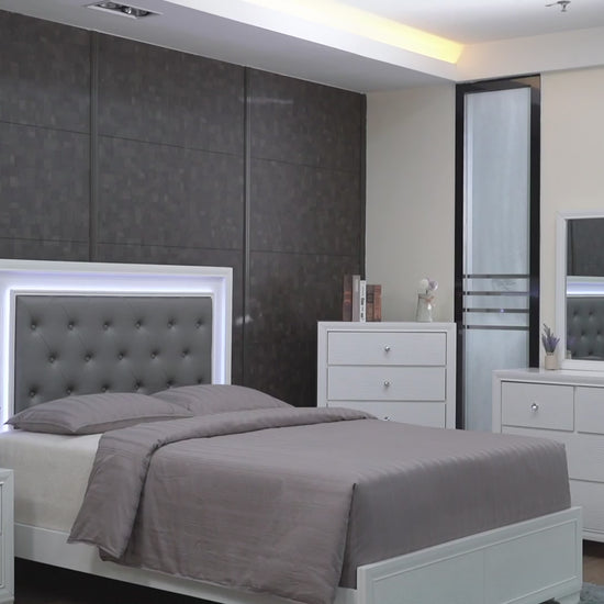 Step into a realm of sophistication and comfort with this stunning bedroom collection. Each piece showcases an exquisite blend of traditional charm and contemporary flair, making a bold statement with its textured surfaces and crisp white finish. The bed, a centerpiece of luxury, features a sumptuous, tufted headboard with integrated lighting that invites a touch of opulence to your restful retreat. Coordinating storage solutions, including a dresser, chest, and nightstand, offer ample space with their gracefully designed drawers, accented with shimmering hardware that complements the set’s chic aesthetic.
