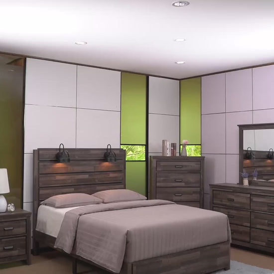 This bedroom set marries rustic appeal with contemporary lines, offering a cozy yet refined aesthetic to any modern home. The set features a generously sized bed with a broad, planked headboard with integrated sconces, creating an inviting ambiance. Flanking the bed are a matching nightstand and a chest, each providing ample storage with a series of drawers that glide open effortlessly. The dresser, complete with a wide mirror, offers additional storage and an area to get ready, all while contributing to the room’s open feel. The distressed wood finish of each piece is complemented by dark metal hardware, adding an industrial touch to the ensemble.