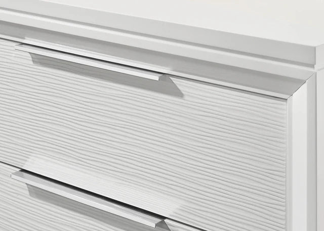 This bedroom set is the epitome of modern elegance, designed for those who desire a sleek and sophisticated sleeping environment. The crisp white finish of the furniture brings a refreshing vibrancy to the room, making it feel both spacious and inviting. The centerpiece, a plush upholstered bed, features an impressively tall headboard with deep channel tufting and integrated lighting, creating an aura of luxury and comfort. Accompanying the bed are streamlined nightstands and a dresser, each boasting a minimalist design with distinctive textured front panels and discreet handles that enhance the set's contemporary charm. The matching backlit dresser mirror expands the visual space and completes the look, making this collection a perfect blend of function, style, and comfort for the modern home.