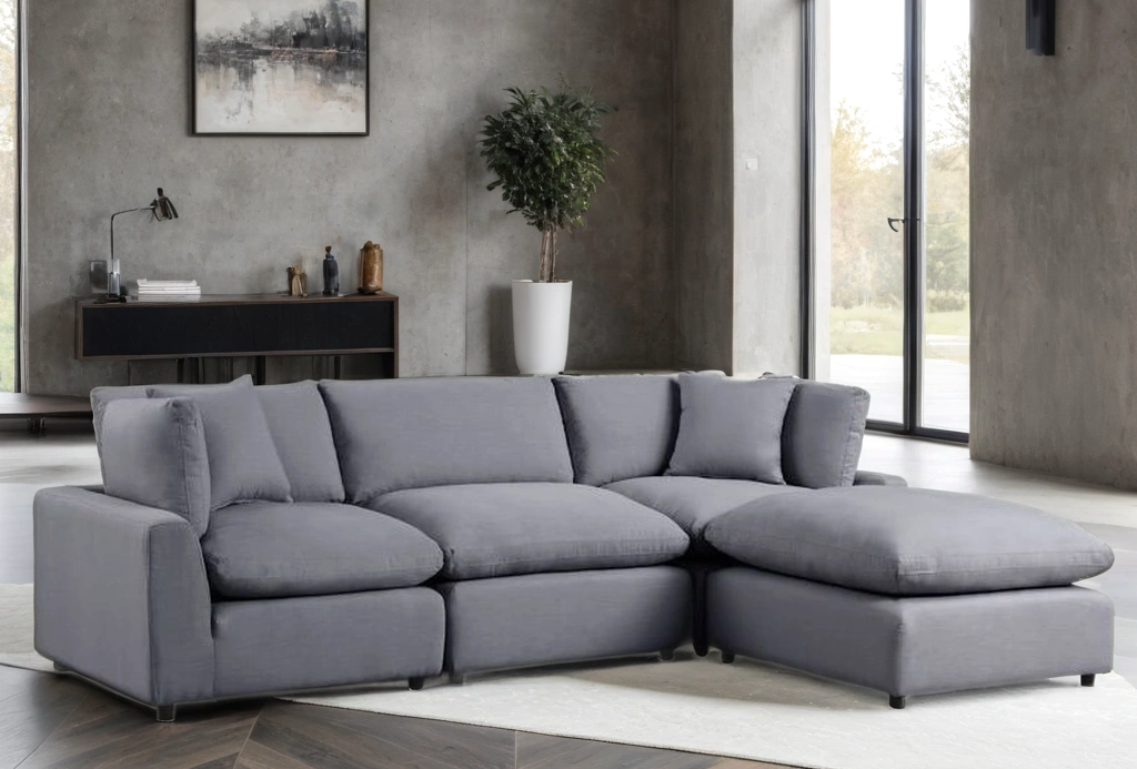 This modern sectional sofa features a sturdy solid wood frame and plush cotton and down cushions for an indulgent, sink-in experience. SKY is adorned with generously padded down feather and cotton cushions, along with cushioned foam bases, making it an ideal addition to the living room, family room, or game room. Crafted for both sprawling lounging and cozy curling up, SKY invites you and your guests to settle in and enjoy the moment. Equipped with plastic foot glides, the corner piece includes two back pillows and a throw pillow. Each seat has a weight capacity of 331 lbs.